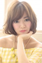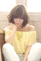 全体にふんわりとしたカールのあるボブスタイル。やわらかで優しい雰囲気のスタイルです。カラーは明るめのベージュ系で夏の一押しスタイルです。